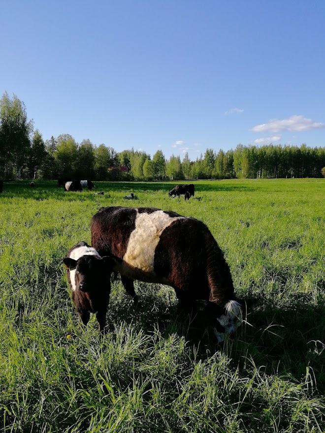 Tilamme eläimet laiduntavat ympäri vuoden ulkona. Peltoja ja perinneniittyjä on aivan tilamme ympäristössä. Kesäisin viemme osan eläimistä laiduntamaan niittyjä myös Hirvensalmen Malvaniemeen, missä sijaitsee lähistöllä myös mökkejämme. Eläimet saavat luomutilalla nauttia puhtaista ja luonnollisista laitumista. Lihakarjarotumme edustavat rotuja, joiden kasvatustapa ei ole luontaisesti intensiivistä vaan pärjää hyvin korsirehuruokinnalla ilman viljaa. Nurmivaltainen ruokinta on ympäristöystävällisempää toimintaa runsaamman hiilisidonnan kautta. Hitaampi kasvatustapa saa aikaan myös lihaan aromikkaamman maun.