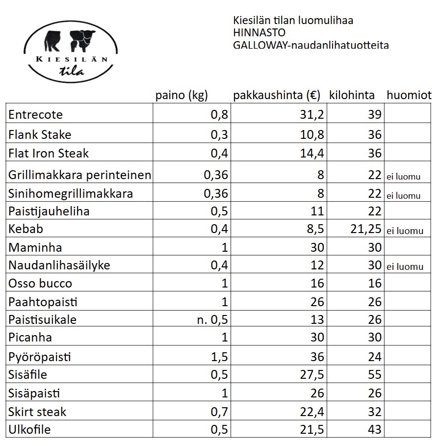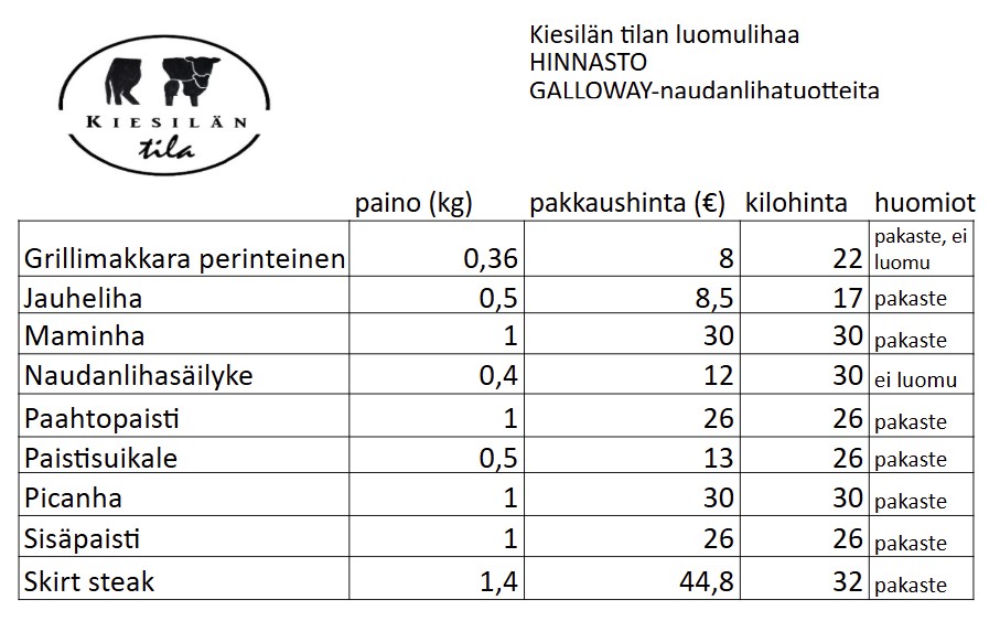 Lihatuotteemme ovat luomua ja lähiruokaa. Myymme tuoretavaraa, kun lihatuotteet tulevat suoraan teurastamolta. Tuoretavaraa meillä on tarjolla muutaman kerran vuodessa. Hinnastossa on mainittu erikseen, jos tuote löytyy pakasteena. Lihasäilykkeemme säilytetään huoneenlämmössä.